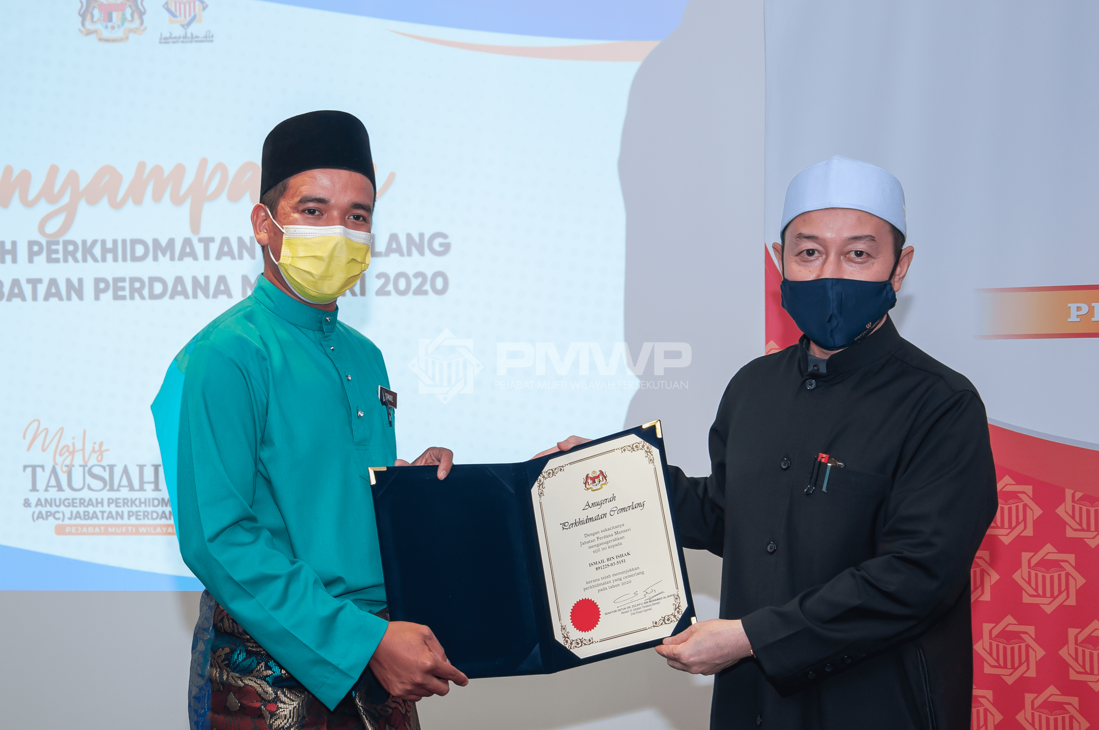 Sahibus Samahah Datuk Dr. Luqman turut merakamkan ucapan penghargaan dan Tahniah kepada para pegawai yang menjadi penerima Anugerah Perkhidmatan Cemerlang (APC) peringkat Jabatan Perdana Menteri bagi tahun 2020 iaitu Ustaz Tajul Urus Bin Abdul Halim, Ustaz Ismail Bin Ishak, Puan Noor Irma Binti Mohd Noor dan Puan Siti Zulaiha Binti Khalid.
