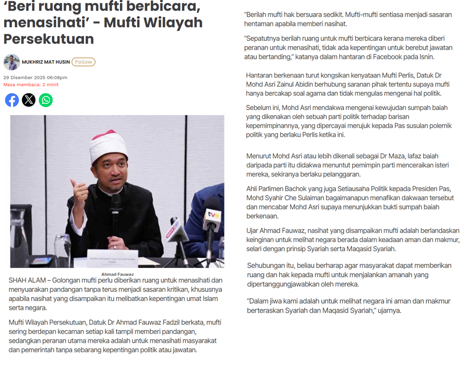 | 29 Disember 2025 | "Beri ruang mufti berbicara, menasihati - Mufti Wilayah Persekutuan" | |